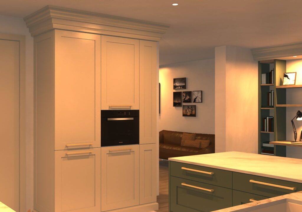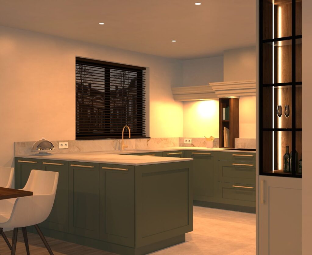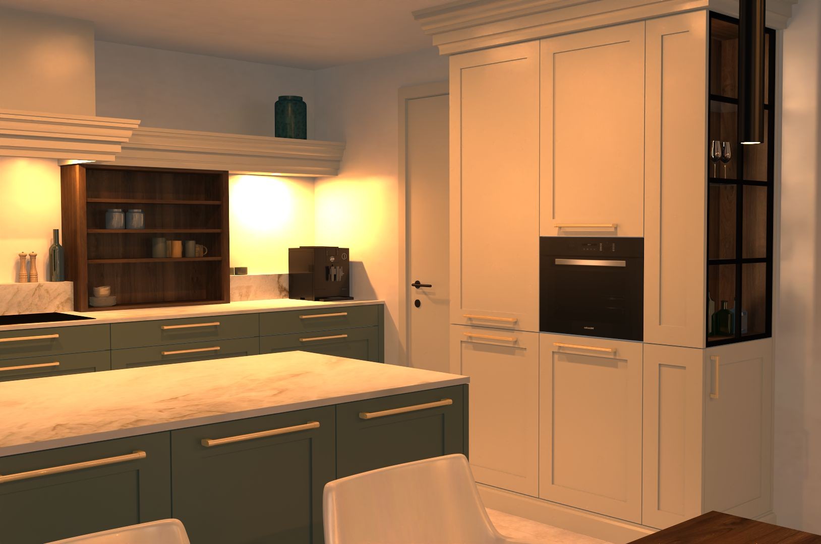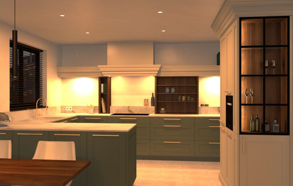 keuken met een klassieke uitstraling: gelakte kaderdeuren in crème en eucalyptusgroen, details in notelaar en goud.