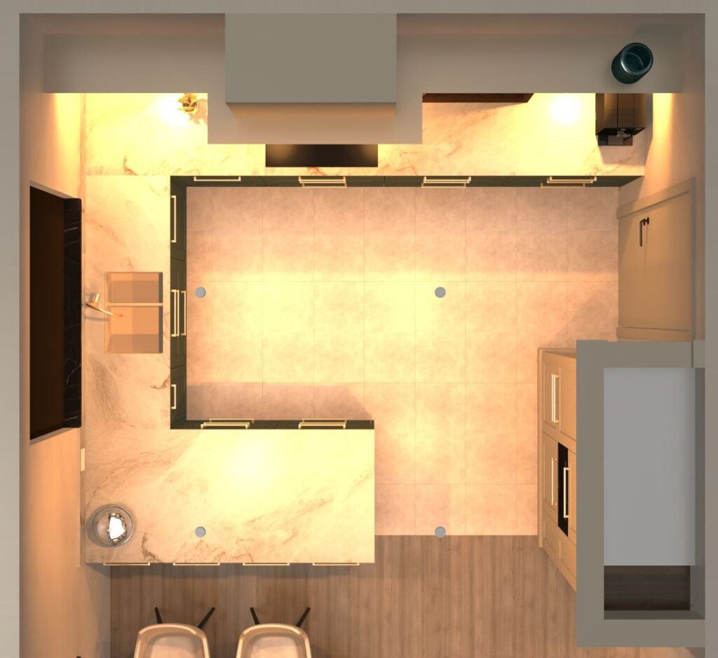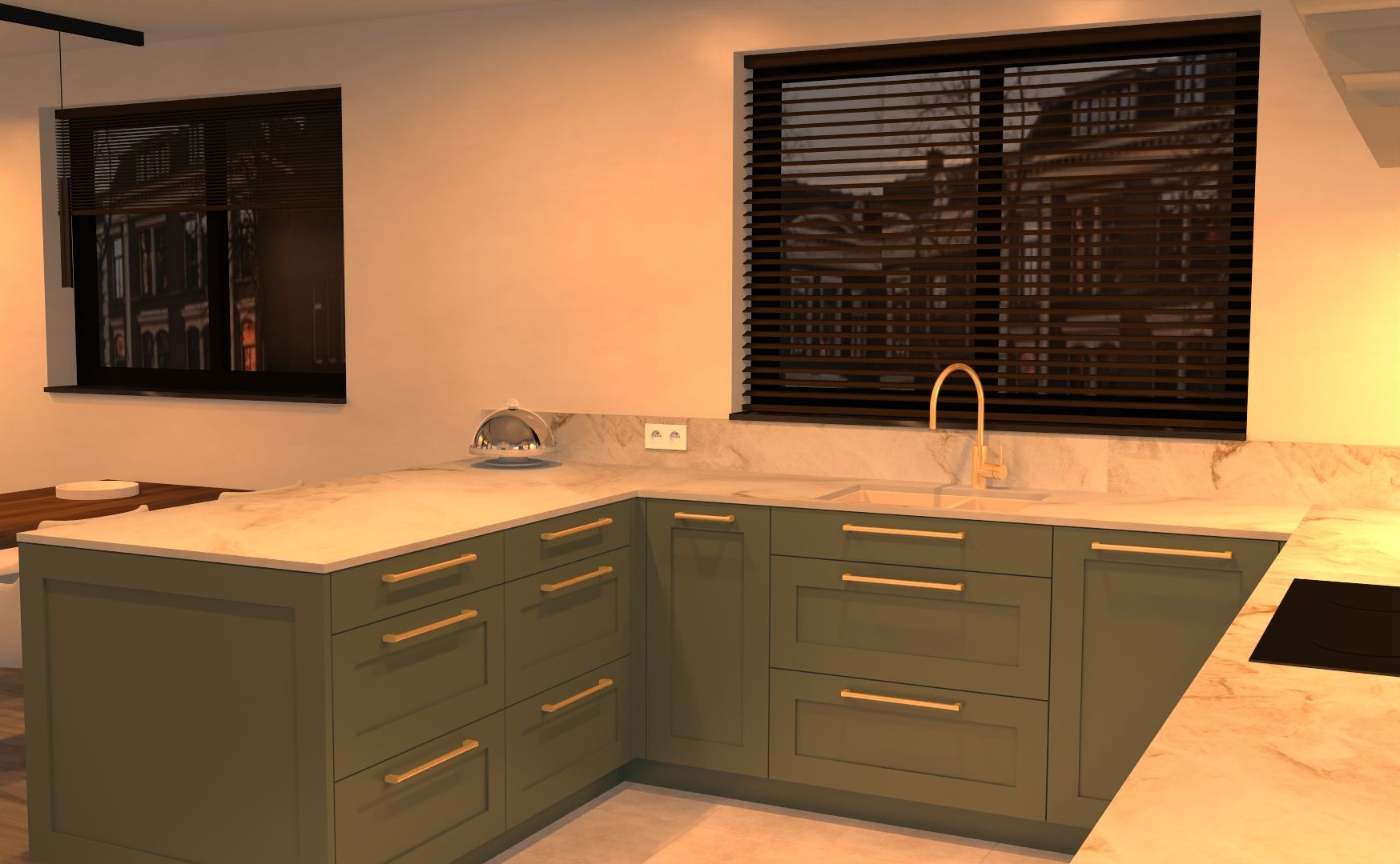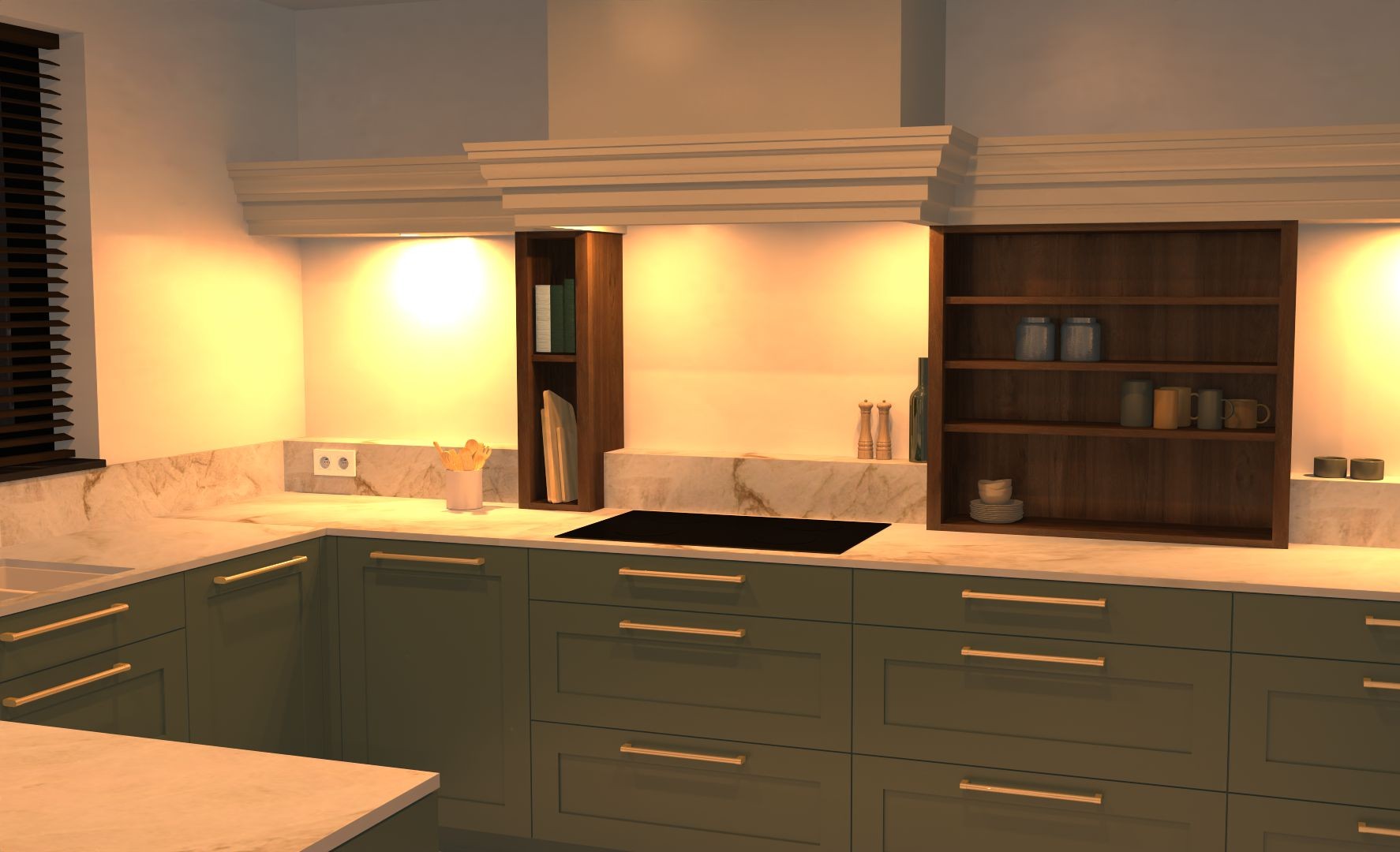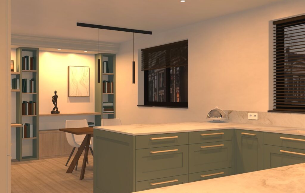 keuken met een klassieke uitstraling: gelakte kaderdeuren in crème en eucalyptusgroen, details in notelaar en goud.