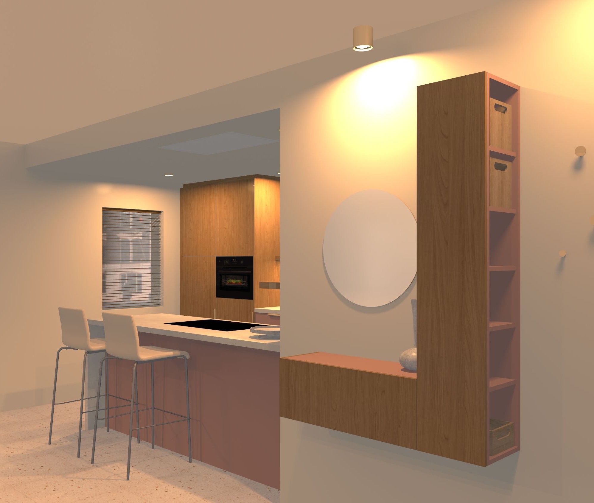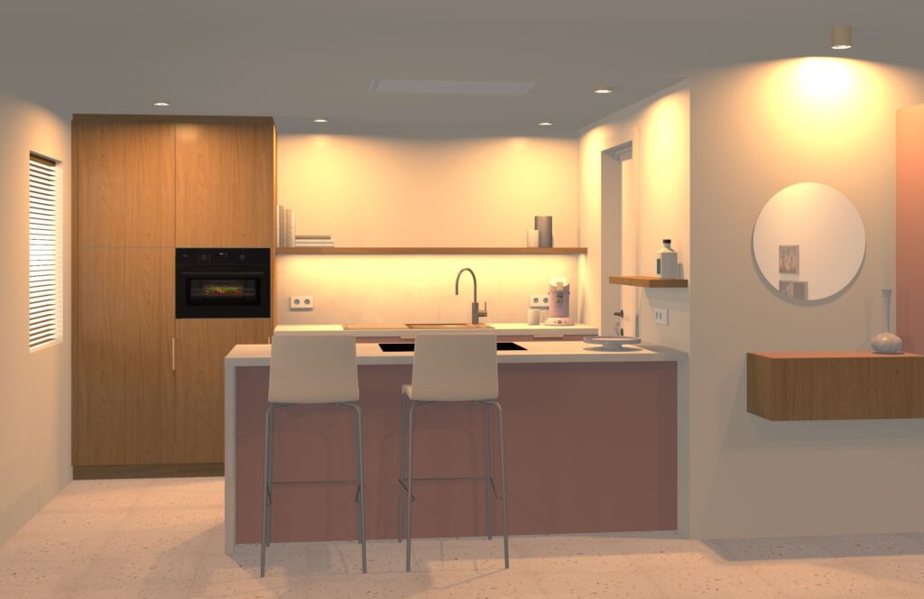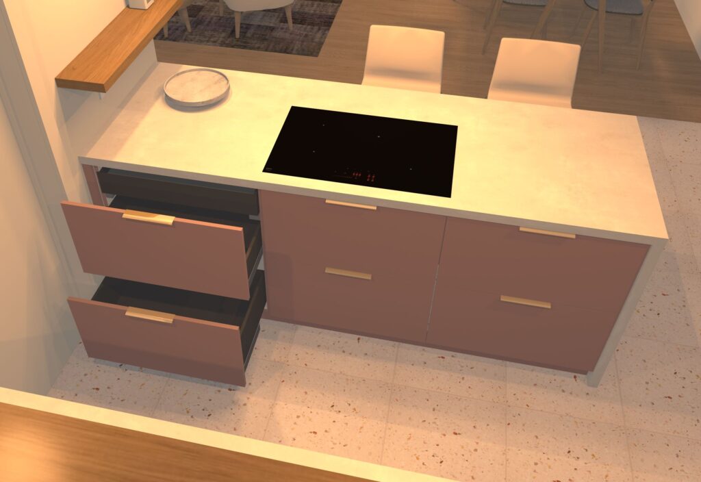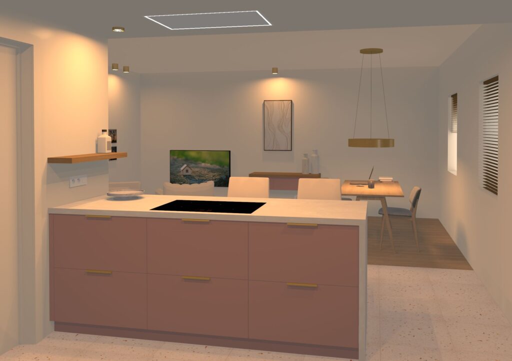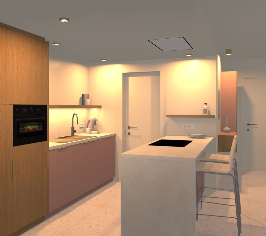 Eik, antiek roze, messing, werkblad ‘factory cream’.